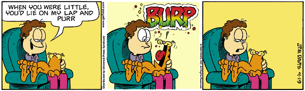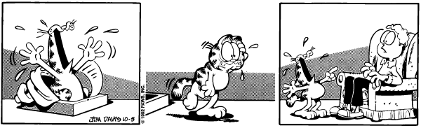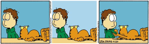 Kind of odd how the dialogue kills the joke. I temember that brief period of time when Jim Davis went insane and was drawing thre craziest strips imaginable, but now it's turned into a watered down parody of itself.