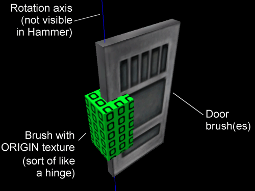 Then you need to place a special brush called an ORIGIN brush. It is the green brush in the picture. It is used to set the 'center' of your door. Your door can only rotate around its 'center'. You can set the center anywhere, even outside the door.